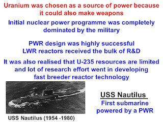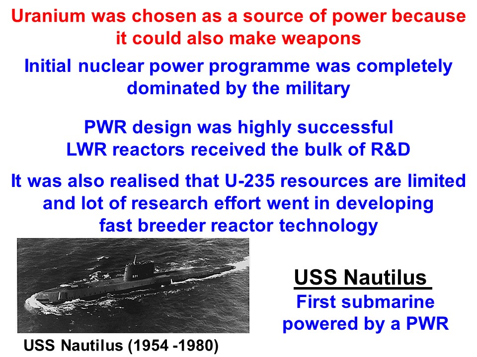 Unfortunately, Th is of not much use for nuclear weapons and most nuclear research, bomb and power production, was under military control. Uranium had proved its worth and that is what the military wanted. There was little or no encouragement for continuing research with thorium even though it had much better credentials for a civilian power generation programme.