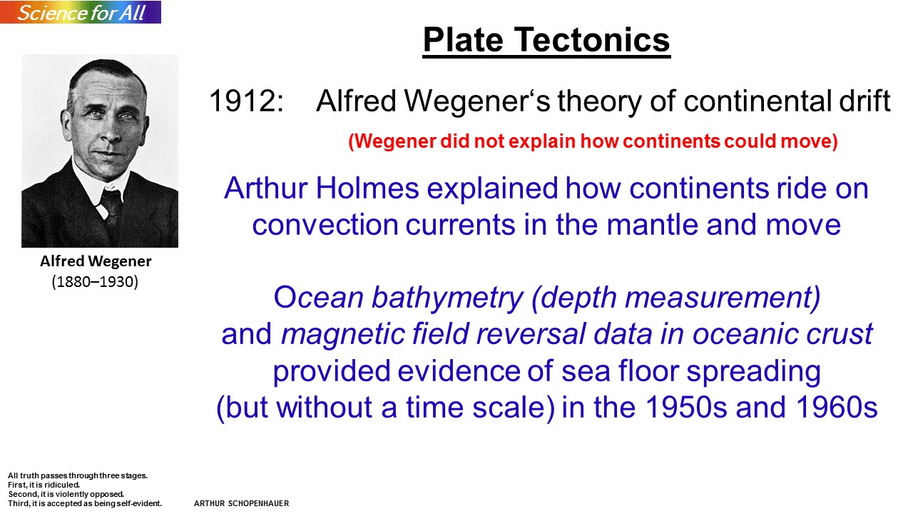 We still have to address the mechanism of continental drift - or as it is now known - plate tectonics. There is a lovely set of slides, 147 in total, that really cover the subject in great detail. I shall briefly summarize it here.