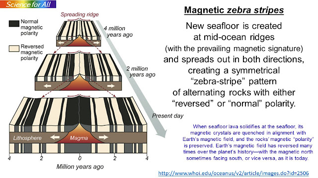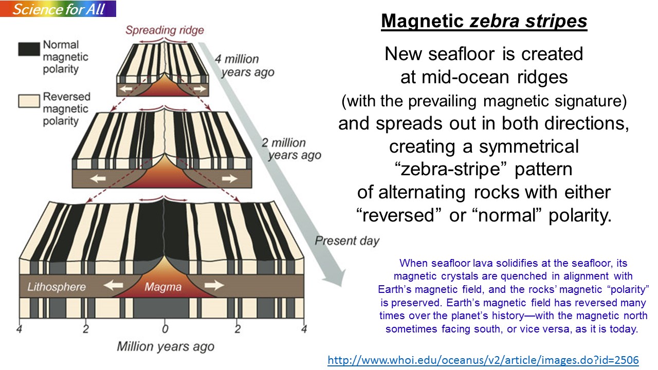 The formation of magnetic zebra stripes is interesting. Earth’s magnetic field has reversed many times over the planet’s history—with the magnetic north sometimes facing south, or vice versa, as it is today.