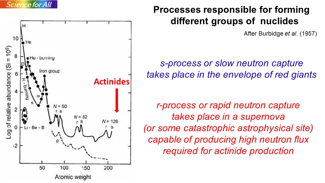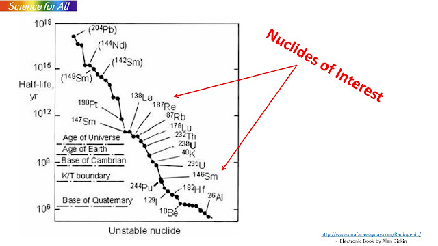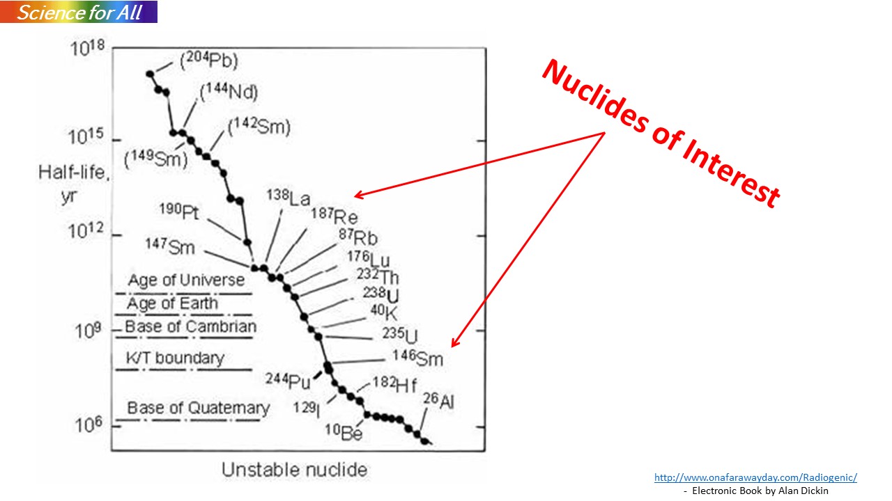 In RD, the nuclides of interest are those which decay with a half life of the order of the age of the Milky Way - a few billion years (by). From the slide, we notice that Th-232 (half-life =14 by) and U-238 (half-life = 4.47 by) are useful actinides for dating purposes.
