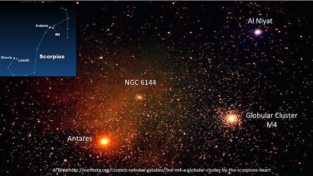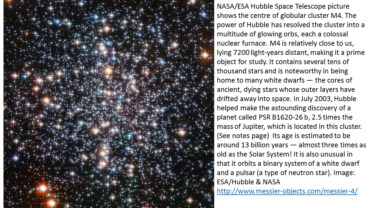 Located 7,000 light-years away in the direction of the constellation Scorpius, M4 is the nearest globular cluster to the Earth. Globular clusters like M4 were born early in the history of the Milky Way. M4 is estimated to be about 13 billion years old and all of its stars that began with 80% or more of the Sun's mass have already evolved to become red giants, followed by a collapse to a white dwarf. (Our Sun will not become a white dwarf for another five billion years.)