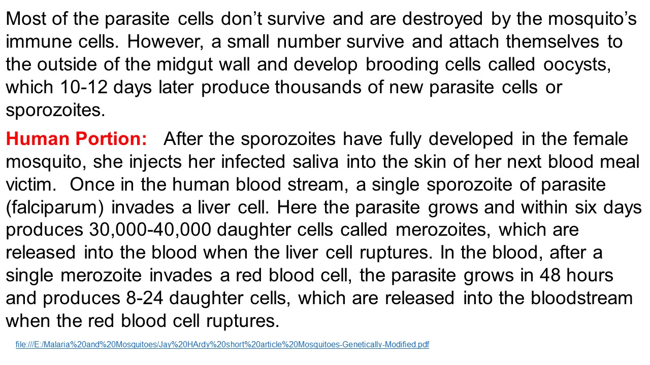 One also needs to weigh the situation when millions of people are infected by malaria every year which results in great loss of economic activity and loss to the communities. This level of tragedy must be addressed and it seems to me that the negative arguments against GM are weak in this case.