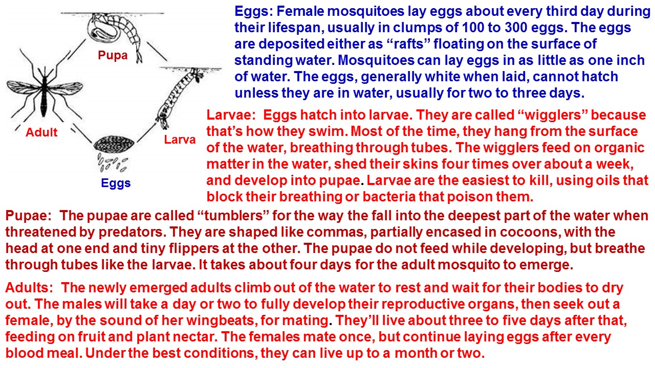To start with, it will be useful to understand the mosquito life-cycle -- a mosquito has four stages in its development and takes about two weeks to develop from an egg to a functioning adult.