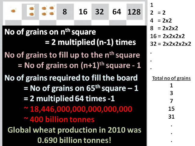 Pleased with the musician, the king asked him to choose any prize he wished for. The musician asked for some grains of wheat. He asked that on a chess board a grain be placed on the first square and the number of grains is doubled on each subsequent square. the king laughed at the naivety of the musician and granted his wish. This is what happened: