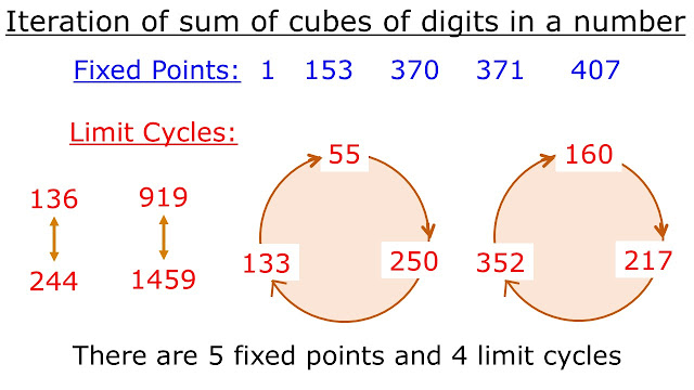 Therefore, a sum of cubes iteration on an arbitrarily large number (of 5 or more digits) will always result in a smaller number (the final theoretical maximum value of the sum being 2916) but not for a number with four or fewer digits.