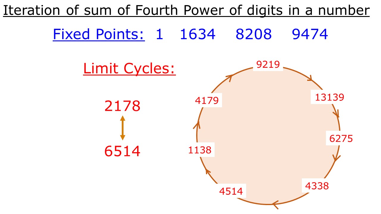 It may be shown that for an n digit number N, if n > k + 1 where k is the power to which each digit is raised, N is always greater than the sum of kth power of digits. Fixed points and limit cycles will lie in the range from 1 to (k+1) x 9^k.