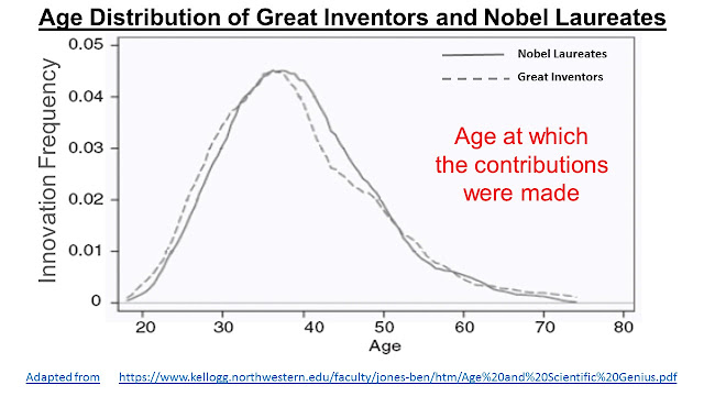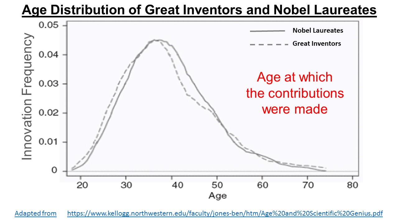 In Part 1, I had looked at the prevailing perception that younger people (age less than 30 years) are more innovative than their older peers. In reality, scientists and business workers innovate far more effectively only after reaching an age of about 40 years. Fundamental research by Nobel Laureates and profit-directed innovations (patents) in the industries show a close similarity of innovation frequency and age. Given the very different motivations in the two groups, this is an interesting finding. The slide shows the age at the time of innovation.